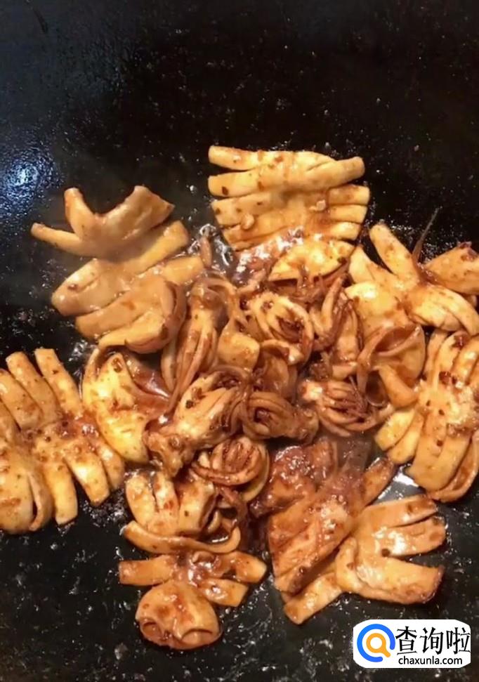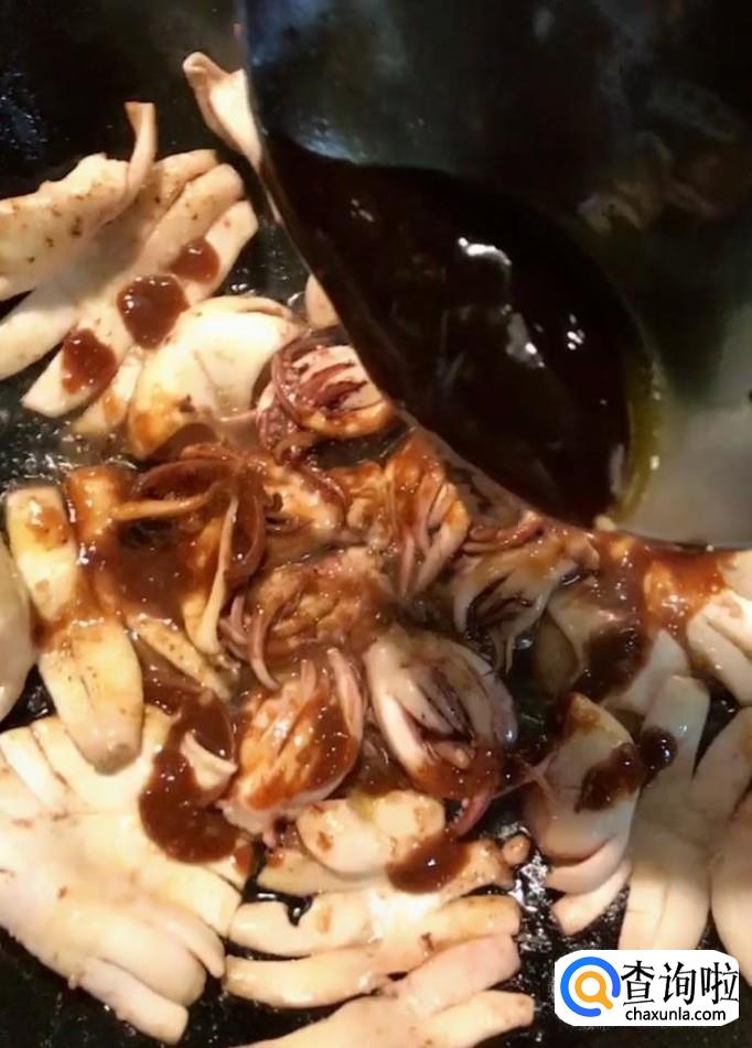 然后我们在一个干净的锅中放入少许油,油热下入鱿鱼,煎熟以后我们放入适量的蒜蓉辣酱,适量的蚝油,辣椒油