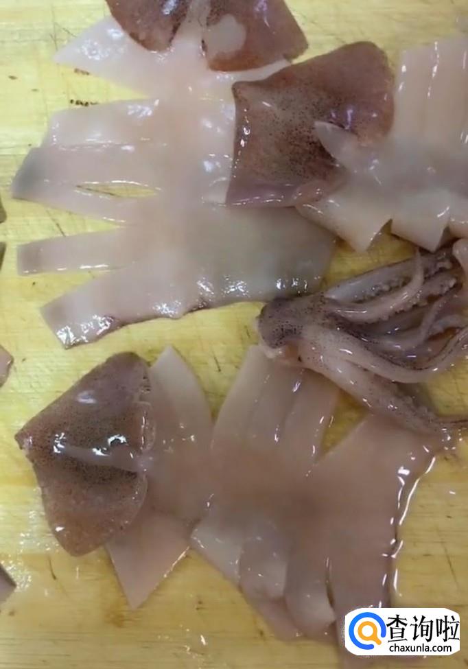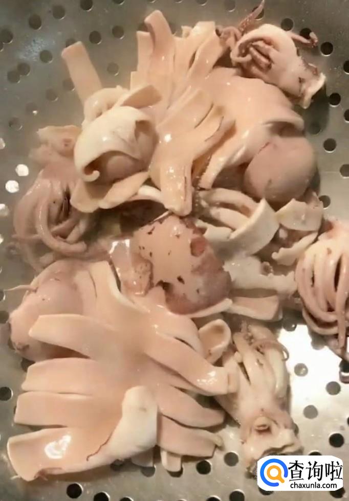 然后我们把处理好的鱿鱼放入热水锅中焯一下,捞出备用