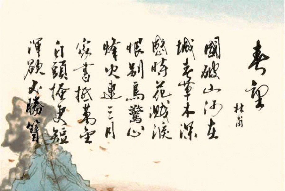 国破山河在出自杜甫的《春望》,此诗作于安史之乱时。唐肃宗至德元载(756)六月,安史叛军攻下唐都长安。肃宗至德二载(757)春,身处沦陷区的杜甫目睹了长安城一片萧条零落的景象,百感交集,便写下了这首传诵千古的名作。