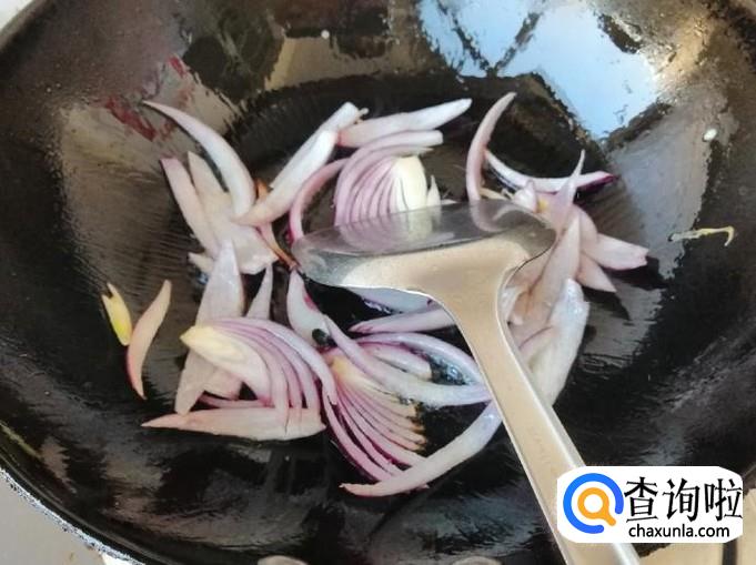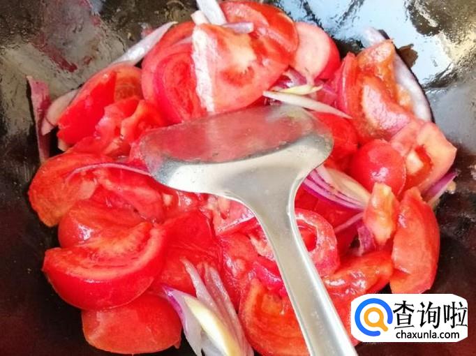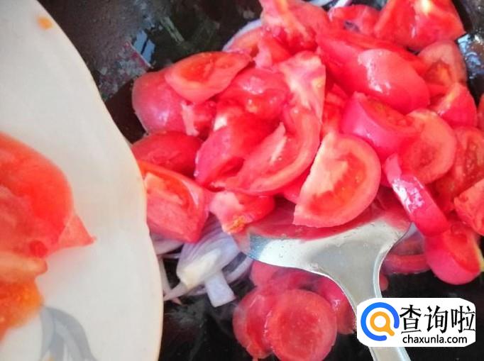 另起炒锅,放入备好的圆葱丝,用铲子快速翻炒均匀,稍炒片刻后,就可以加入备好的西红柿。