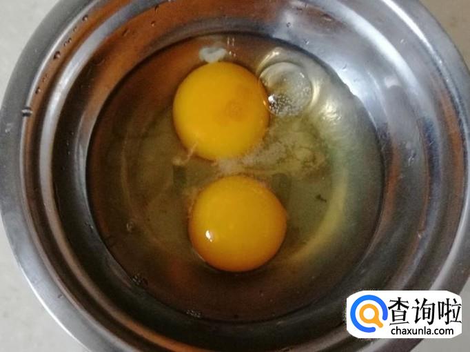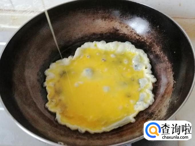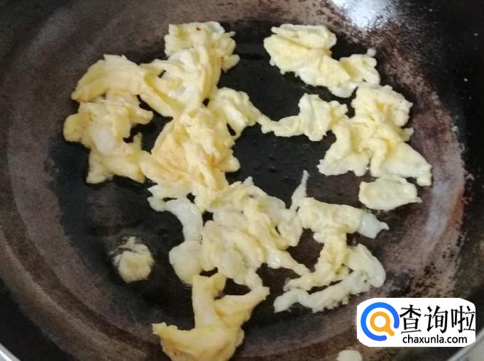 准备两个鸡蛋,用清水把鸡蛋洗净,磕入碗中,用筷子把鸡蛋打散,炒锅放油,油热后,把鸡蛋液倒入锅中,炒成鸡蛋块待用。