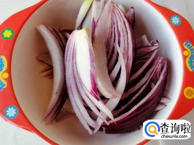 取适量新鲜圆葱,用清水把圆葱洗净,然后圆葱切丝,盛入容器中待用,用量根据自己喜好定。