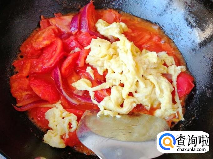 翻炒至西红柿变软出汁后,加入刚才炒好的鸡蛋,用铲子翻炒均匀,加入适量糖调味,家里有糖尿病患者的,就不要加糖了。