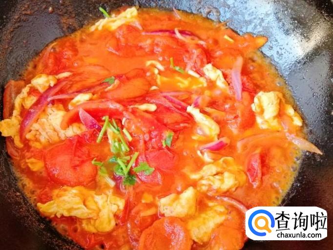 如图所示,西红柿圆葱炒鸡蛋就做好了,放入适量食盐,撒入香菜葱末,西红柿圆葱炒鸡蛋,出锅入盘,上桌开吃。