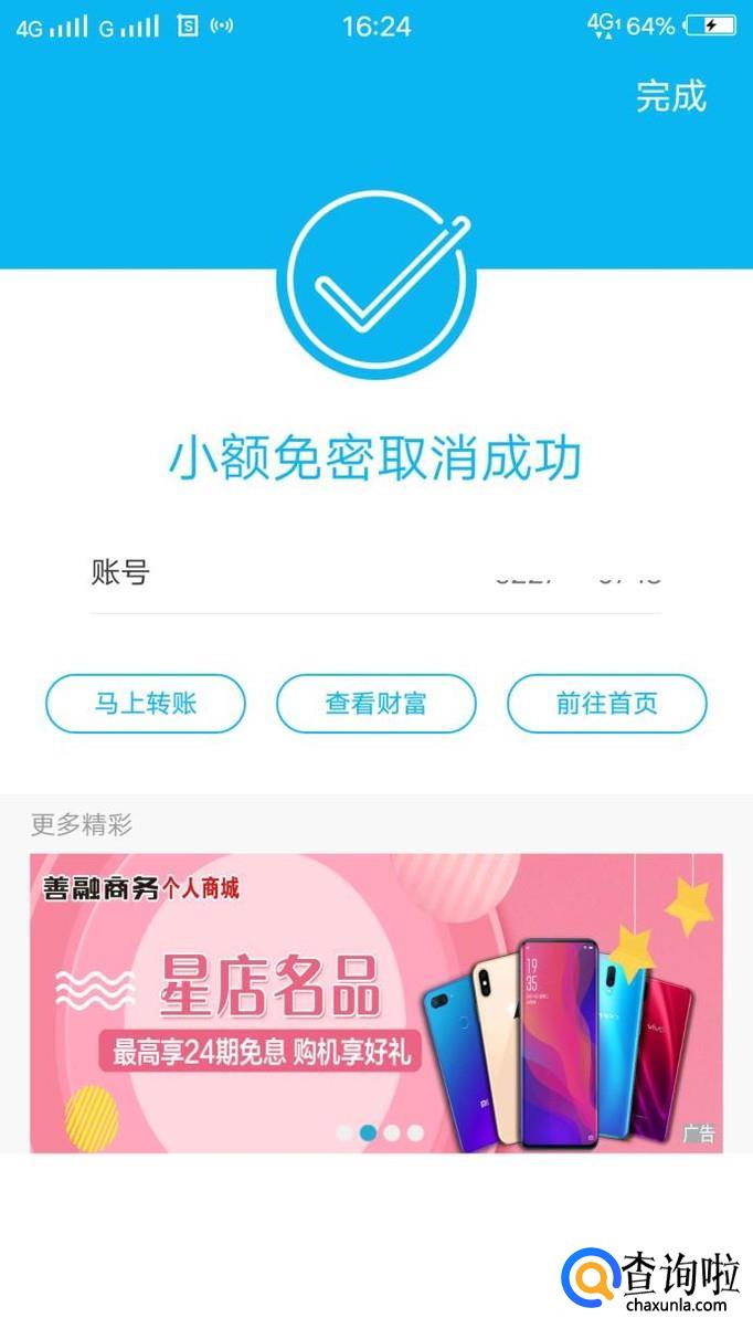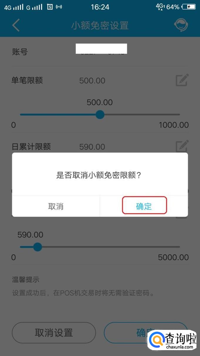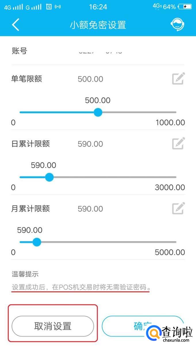 可以看到,当前免密的限额是500,也就是说少于500的交易是不用密码的,我们点击“取消设置”。