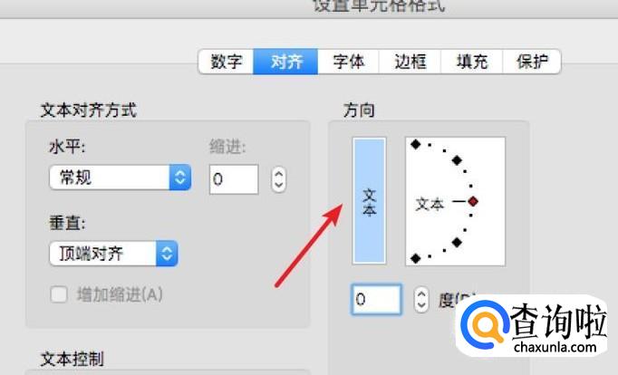 在对齐设置项里,点击选中方向下的‘文本’,点击确定按钮。