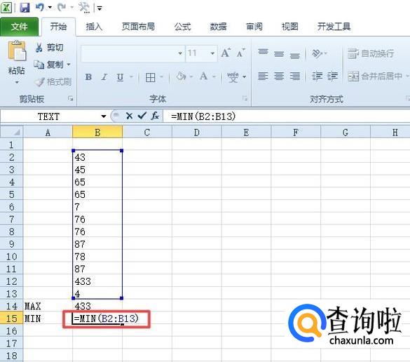 之后我们在图示中的单元格中输入=MIN(B2:B13),然后我们按回车键;