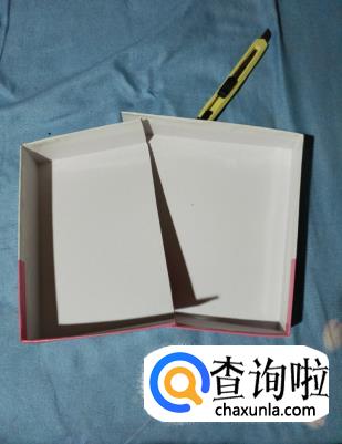 拿出鞋盒盖,用刀子在盒盖的五分之二处划开,形成两个盒盖,如下图。