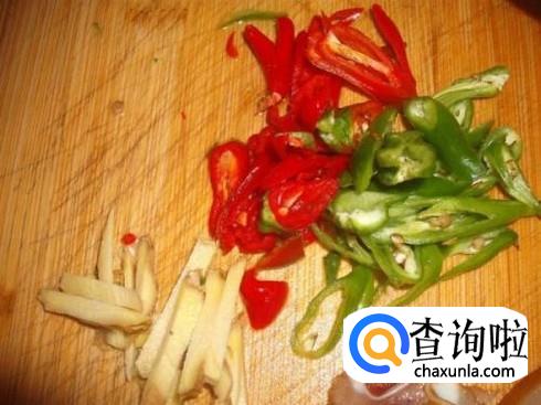 将韭黄清洗干净并且切成小段状,再把辣椒和生姜清洗干净,并且切成丝状,然后放在盘子里面备用。