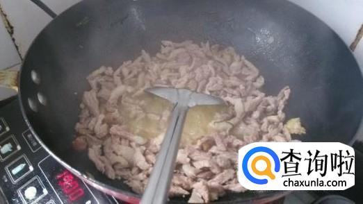 往锅里加入适量的油,等待油熬热以后倒入制作好的肉丝,等到肉丝翻炒到变色的时候就可以倒入辣椒、生姜丝,再一起翻炒。