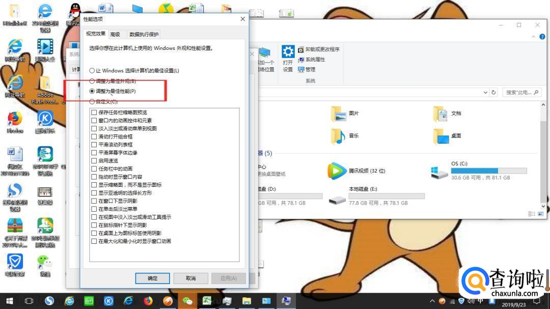 在“性能选项”点击“调整为最佳性能”。这样设置的好处在于,牺牲掉视觉效果,从而达到让系减少对硬件资源的占用,如下图所示
