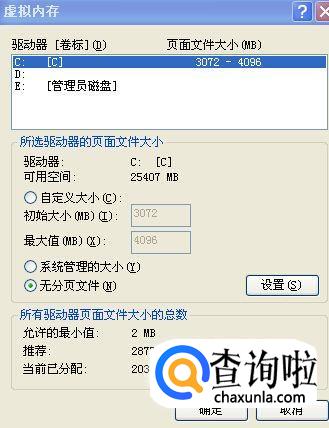 如果,我们的计算机内存实在是不够用的情况下,可以适当更改一下虚拟内存。但是请注意,虚拟内存不是越大越好。一般情况下不要超过物理内存的2倍,否则可能会出现系统运行速度更慢的情况。