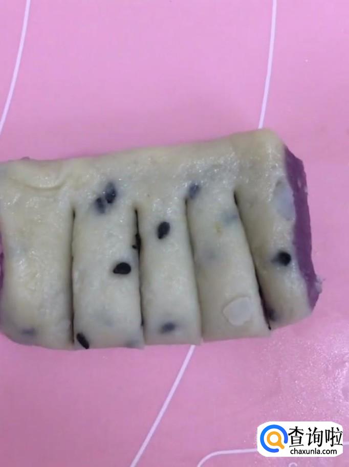 接着我们用刀横竖各切几刀,切成小块,如图所示,然后取一小块对折一下,用刀切几下如图所示