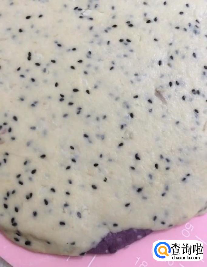 然后我们在面团上面刷一层食用油,用擀面杖擀成大薄片,将红薯的放在紫薯的上面
