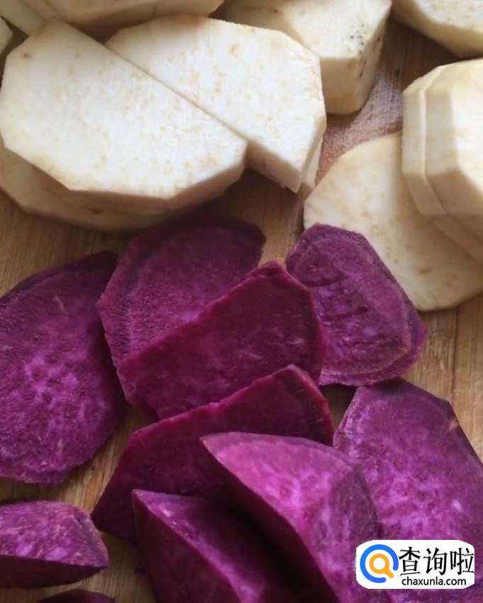 首先我们将紫薯与红薯去皮洗净切成块,放入蒸锅中蒸熟