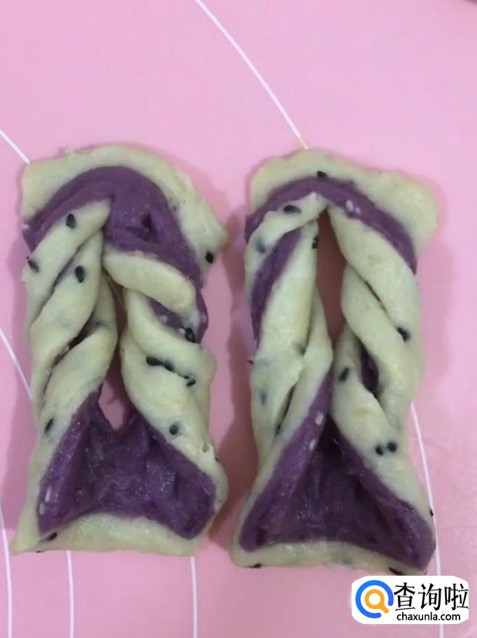 然后我们切好以后打开,从中间穿过去,做成麻花的形状,如图所示,全部做好以后备用