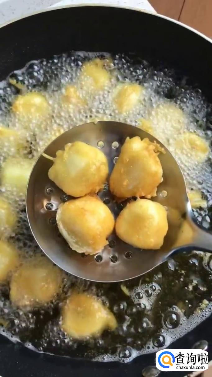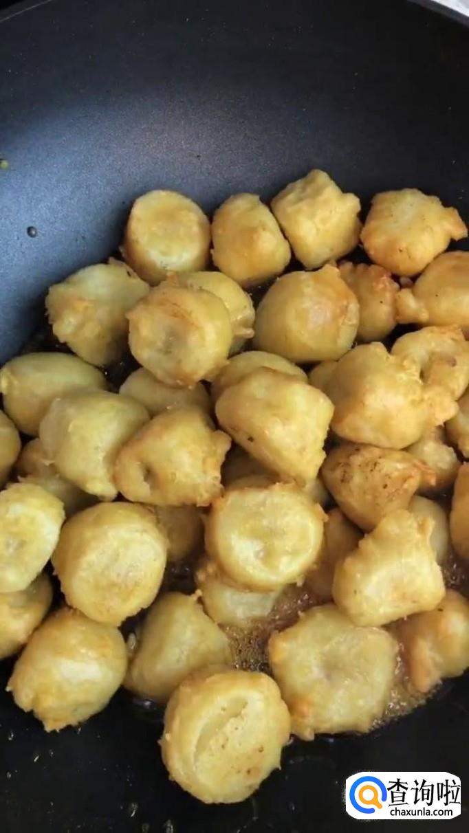 接着把香蕉裹上油炸粉丢到油锅中炸五分钟,捞出沥干,如下图所示。我们只要把香蕉炸成金黄色就可以了。我们在炸香蕉的时候还需要注意的是火候一定要把握好,不能炸的太焦。