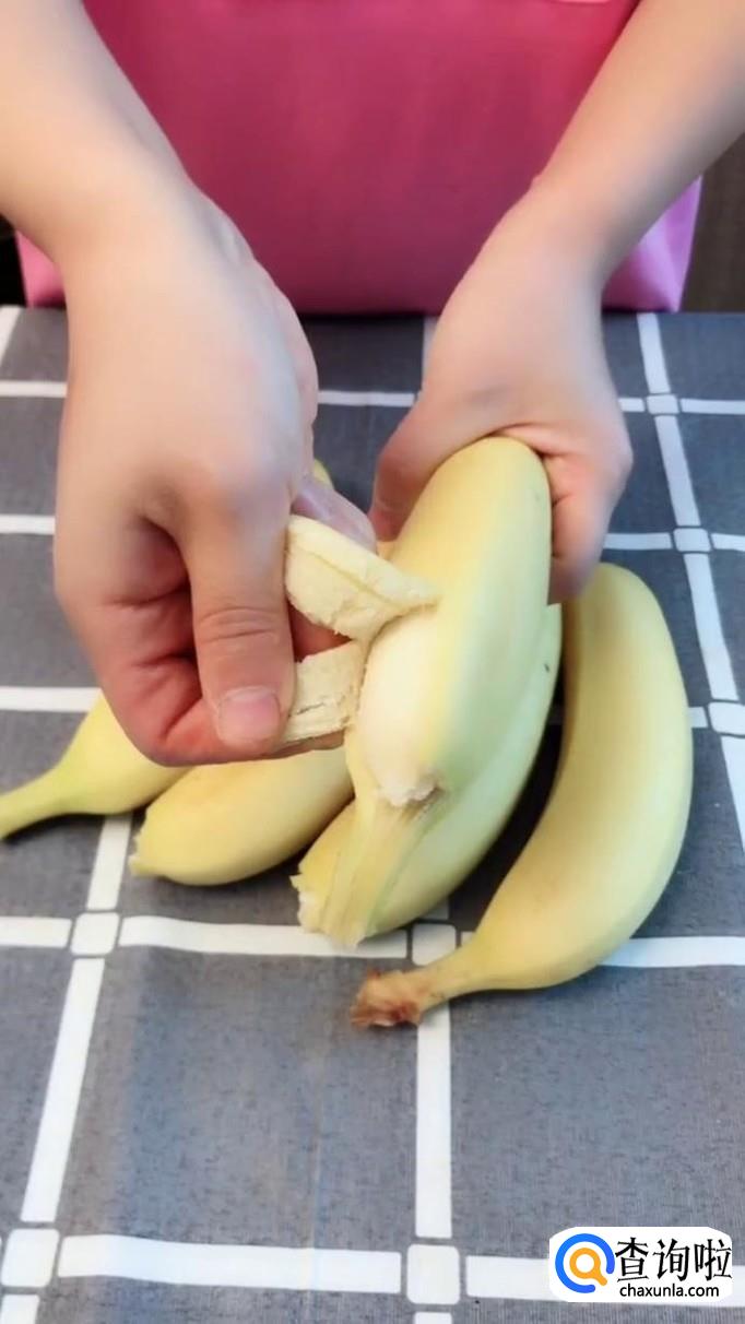 首先将买回来的香蕉剥去外皮,如下图所示。关于香蕉的选择,小编建议大家选择那些表皮光滑且无明显外伤的香蕉进行购买会比较好。