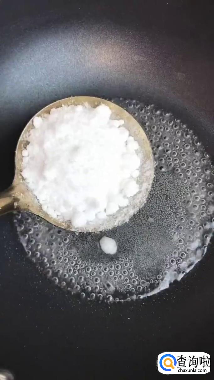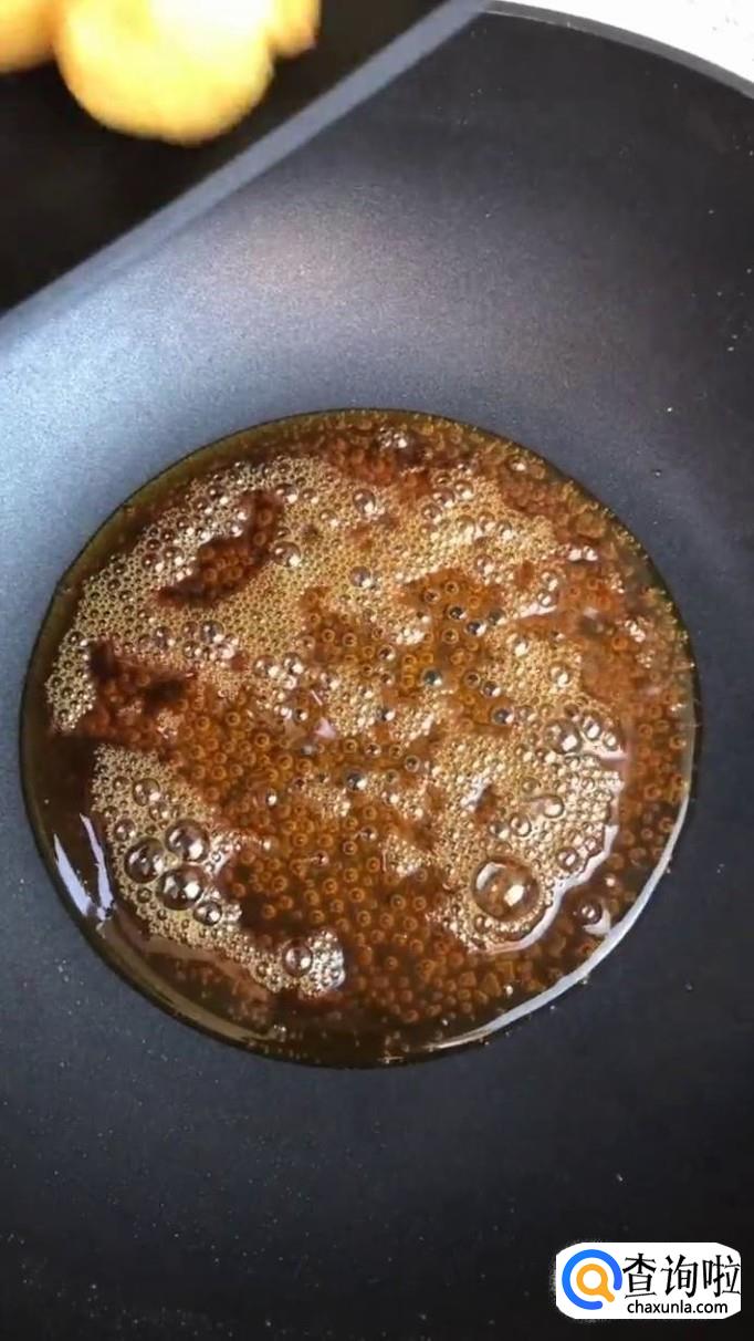 然后往锅中加入适量的食用油,待油冒烟倒入适量的白糖熬制金黄色,如下图所示。