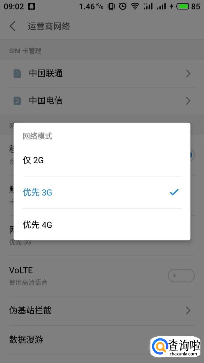 点击网络模式之后,在弹框中点击想要切换的网络就可以进行设置了。