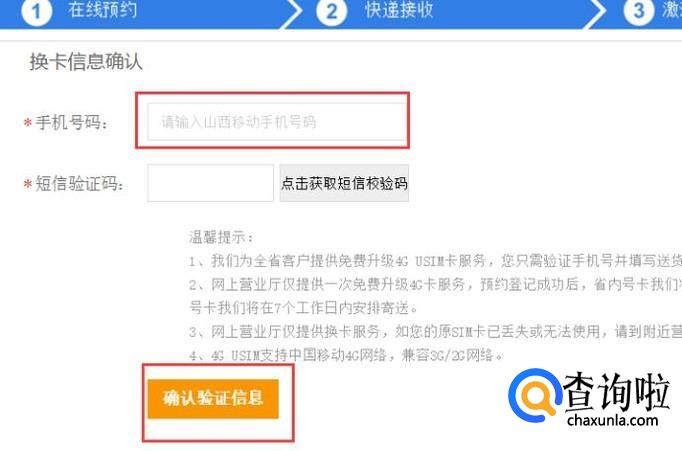 接下来,输入想要换卡的手机号码,同时将手机收到的短信验证码输入到网页中,即可验证完毕。