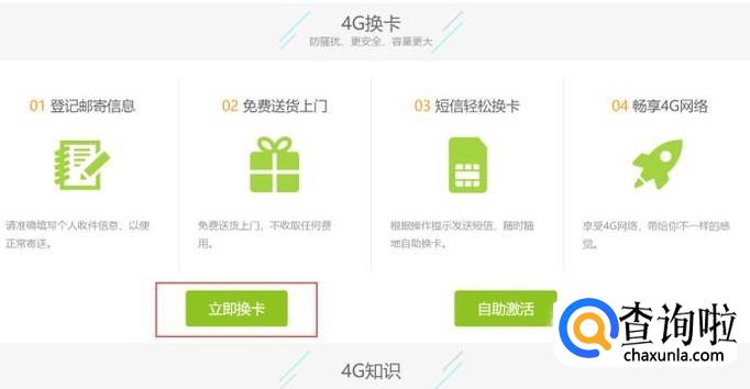 进入4G专区页面之后,找到页面底部的4G换卡功能,并点击“立即换卡”按钮。