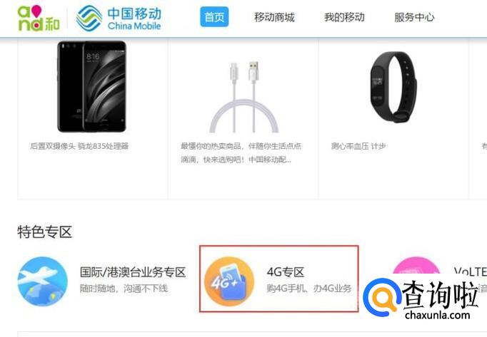 首先,打开中国移动官网,点击页面底部的“4G专区”菜单选项。