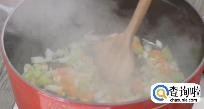 接下来,取炖锅加热,下黄油,橄榄油,倒入胡萝卜丁、蒜末、洋葱丁、芹菜丁、煸炒出香味。
