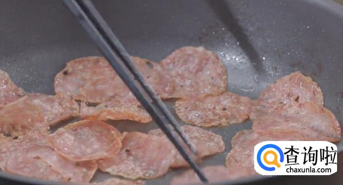 之后取平底锅,大火烧热,不用放油,下培根和萨拉米,煎至焦脆出油。