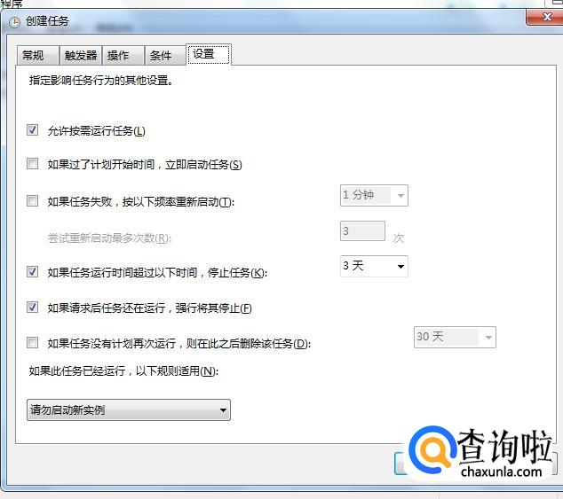 然后单击“设置”选项,进行相关的设置。勾选“允许按需运行任务”,其他的选项可以根据自己的需要进行选择。