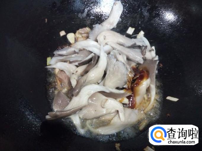 炒至肉颜色微白,放入葱,姜,蒜翻炒,放入料酒,酱油。随即放入鲜蘑翻炒,放入一小匙儿蚝油。