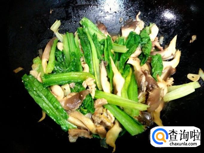 炒至鲜蘑变软,放入油麦菜翻炒,放入盐。炒至油麦菜断生,放入味精,关火出勺。