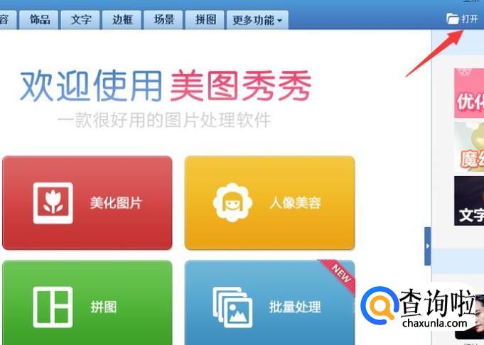 在电脑桌面上双击鼠标,打开美图秀秀,再点一下右上方的打开。