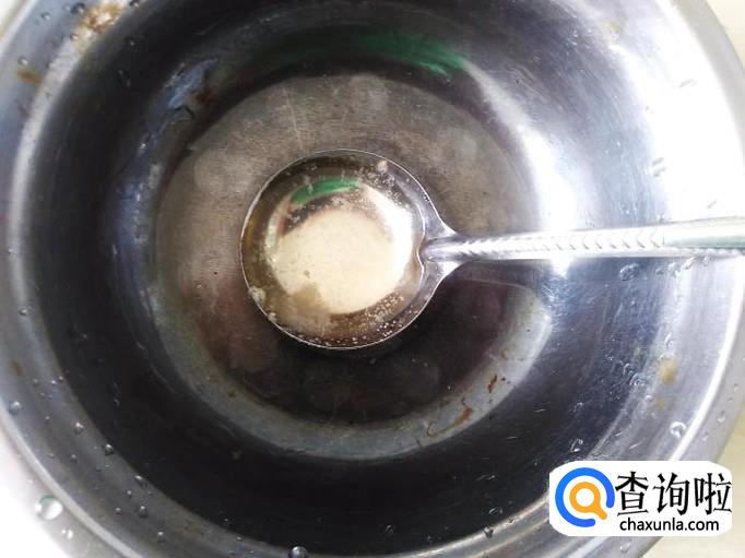 用一个盘子下点油把里面全部刷过,然后把粉团放进去用手压平整。