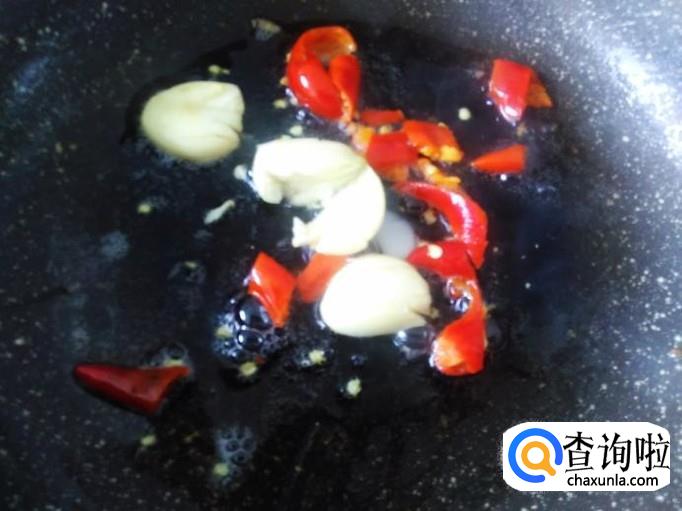 开火下油。放蒜米、小米辣进去爆出味来。