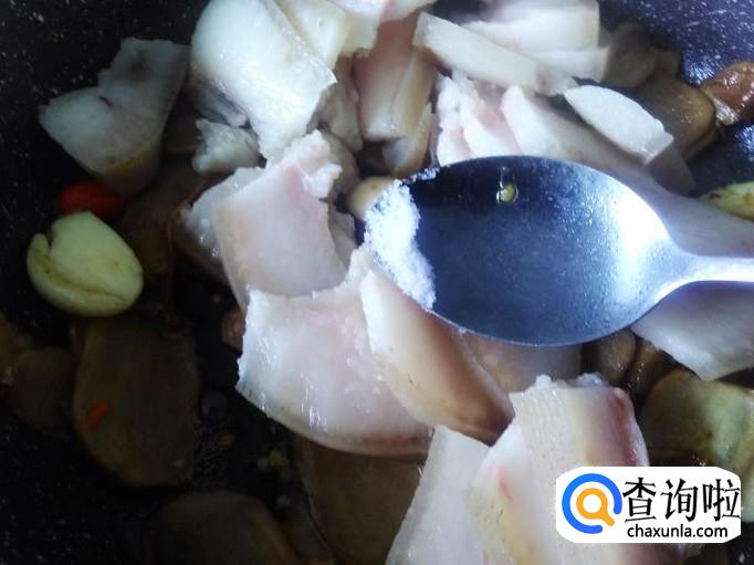 然后放猪头皮进去,加少量的盐、1勺生抽。
