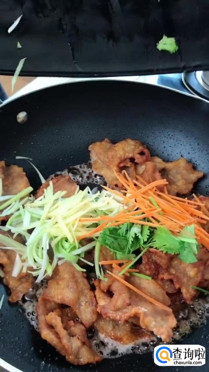 接着把刚炸好的里脊肉倒入锅中并加入葱丝,姜丝和胡萝卜丝,翻炒三分钟,如下图所示。