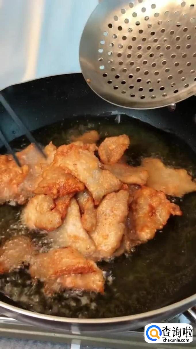 然后锅中加入适量的食用油,待油冒烟,倒入里脊肉炸至定型,捞出控油。