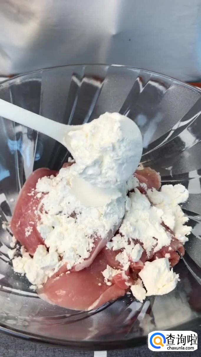 然后把里脊肉用适量的土豆淀粉裹一下,如下图所示。