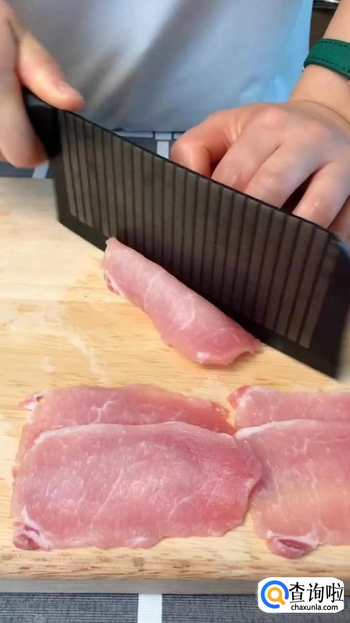 首先将里脊肉切成薄片,如下图所示。为了保证每一片切出来的里脊肉厚度差不多,你可以把里脊肉先放到冰箱的冻层去冷冻15分钟,之后拿出来切会比较方便。