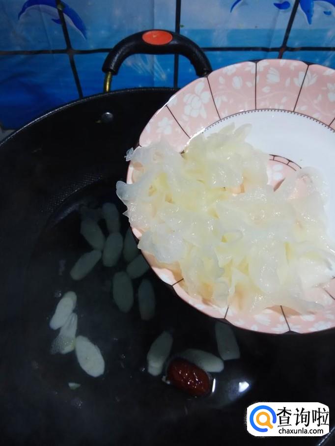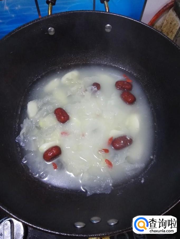 放入适量枸杞,然后加入适量冰糖,冰糖可以增加甜味,而且冰糖也有一定的,清热降燥功效,盖上锅盖,大火将水烧开,水开后转小火炖25分钟左右。