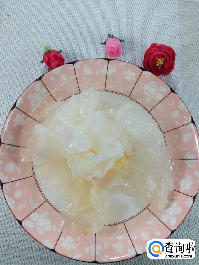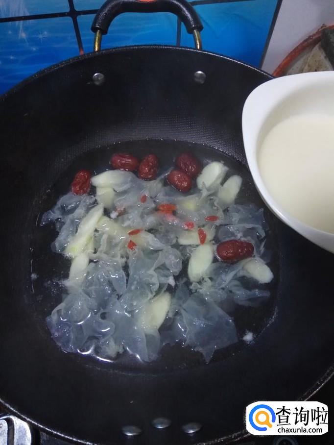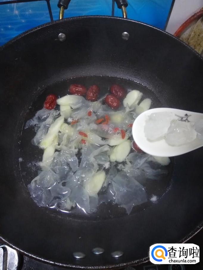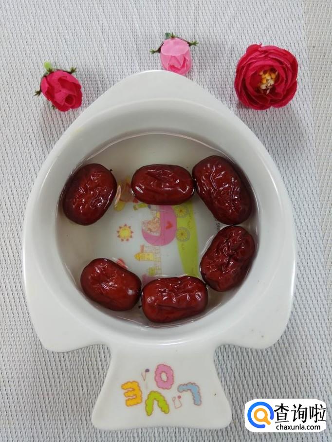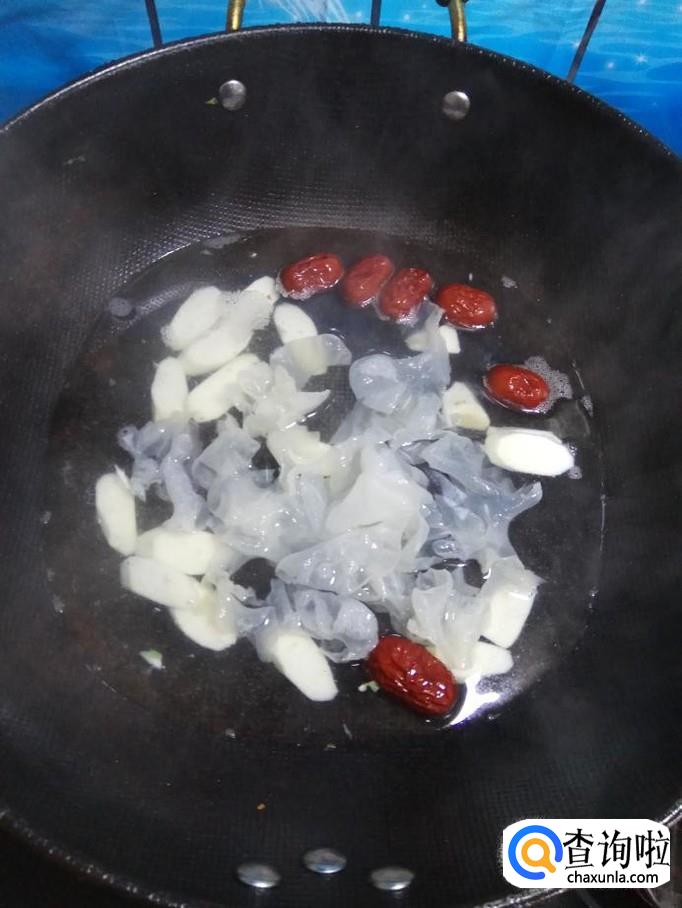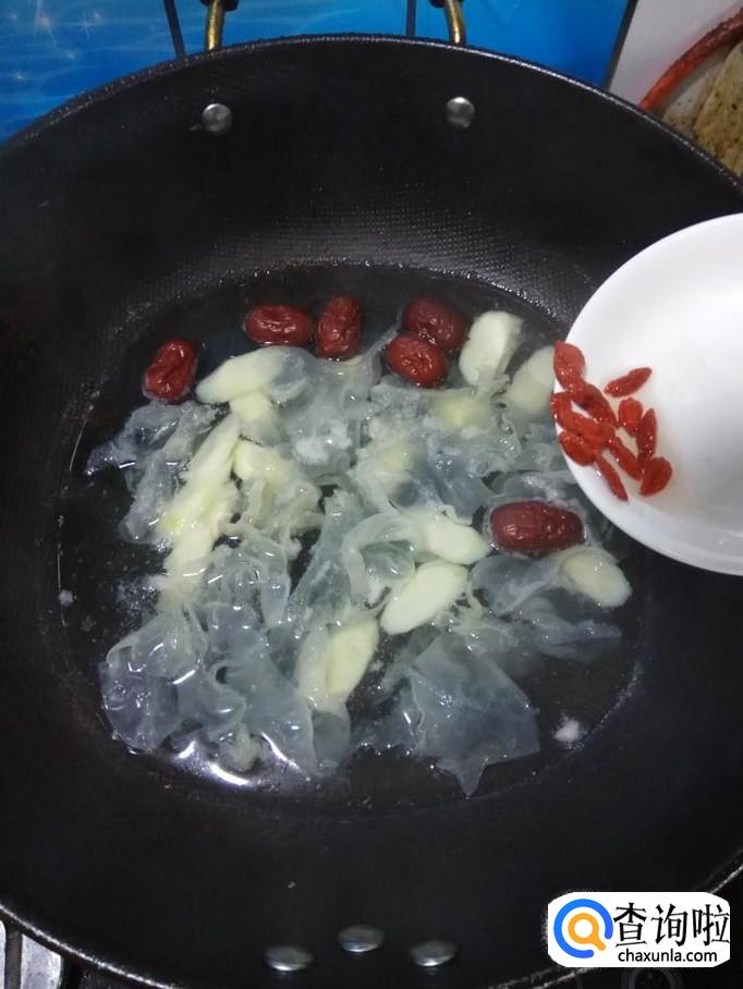 准备适量银耳,用清水泡发,泡发后撕成小朵,放入盘中备用;再准备适量大枣和枸杞子,用清水泡开备用。