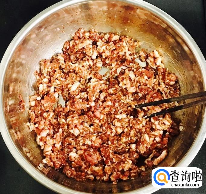 猪肉肥三瘦七剁成肉泥放入容器中,加入适量的花生油、香油、料酒、蚝油、盐、十三香用搅拌均匀