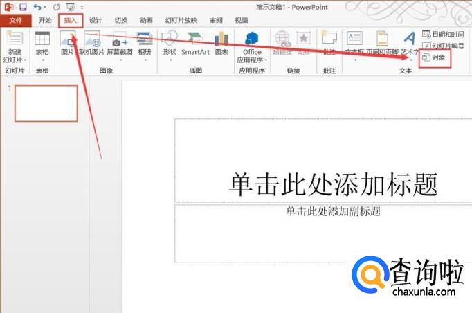 切换到“插入”选项卡,点击下方的“对象”功能。