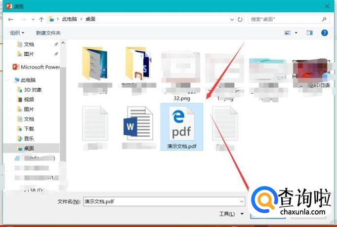 在“浏览”对话框中选中准备插入到PPT中的PDF文件,点击确定。