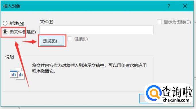 在弹出对话框中点选“由文件创建”,然后点击“浏览”按钮。