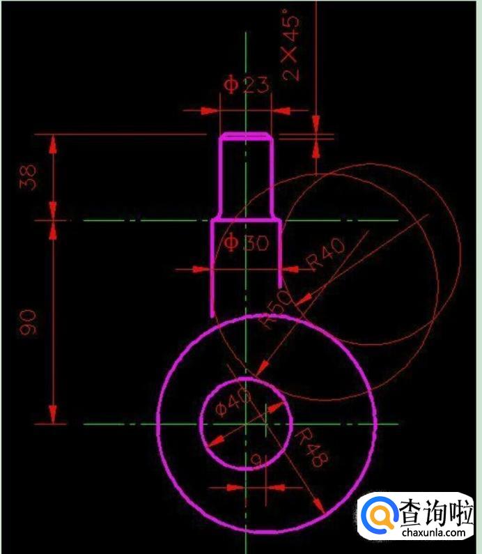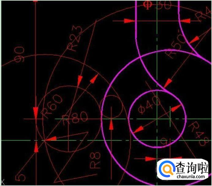 接着在“绘图”菜单中用“相切—相切—半径”画出R40与R50两圆,如图所示。