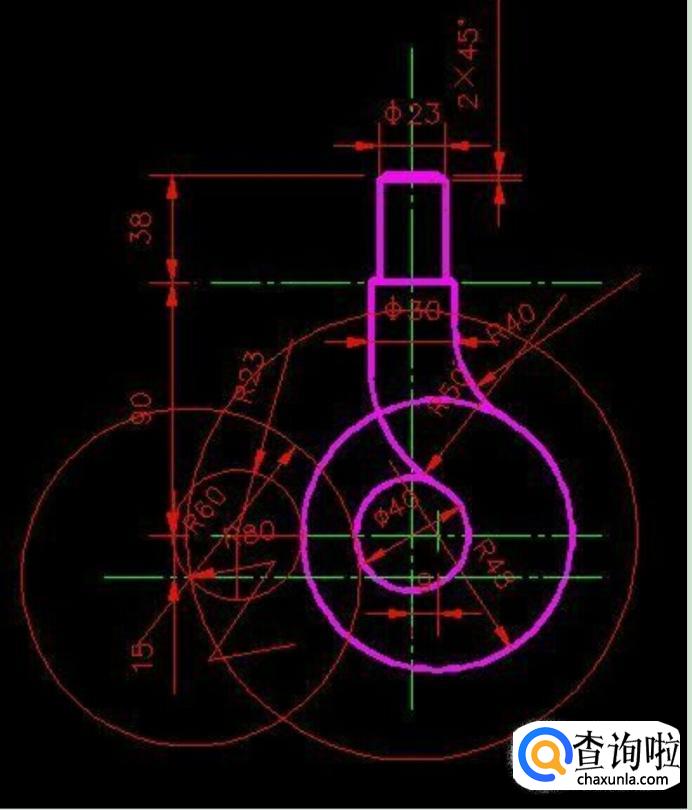 然后修剪,再定位圆心尺寸:一个向下15mm,并作一辅助圆(以主圆心为圆心,以60+20=80为半径);一个向左23mm,分别用半径60、半径23作圆,如下所示。