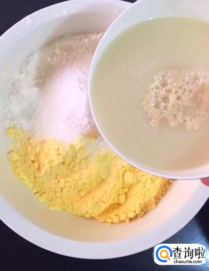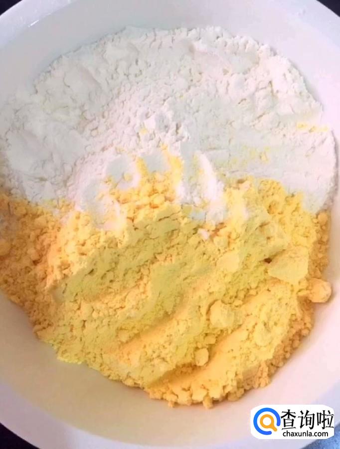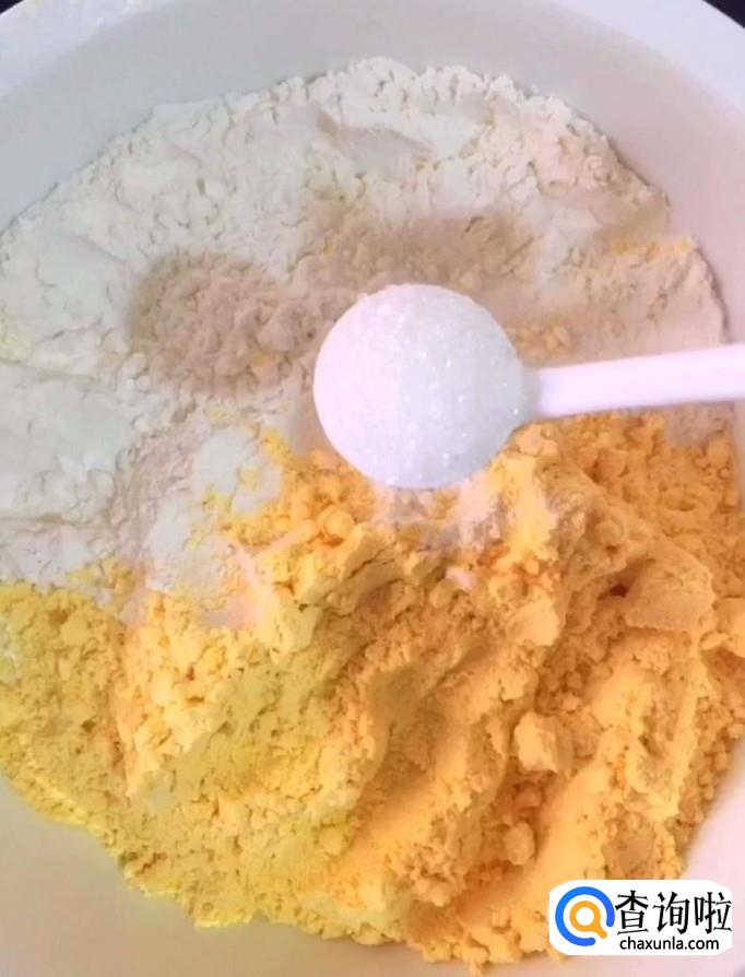 首先我们将玉米面粉与普通面粉一比一的比例放入盆中,加入适量的白糖,再放入5g泡打粉