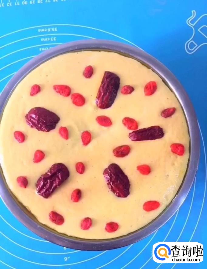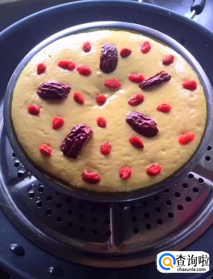 接着我们在发酵好的面糊上面放一些大枣与枸杞,放入蒸锅中蒸45分钟